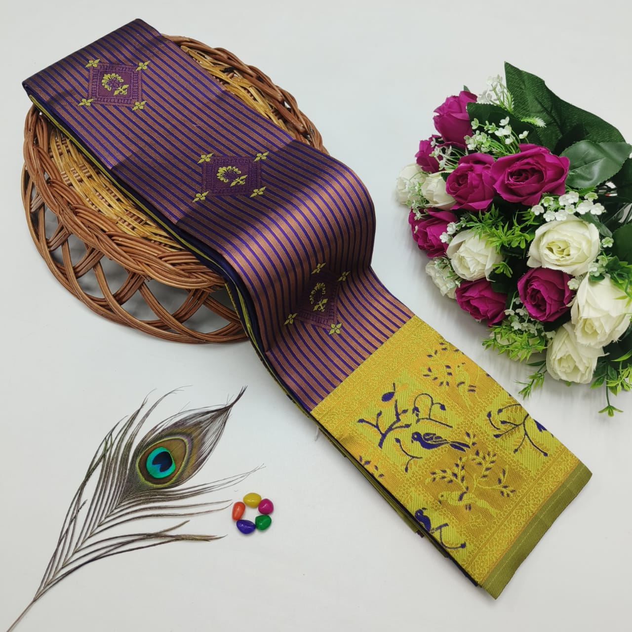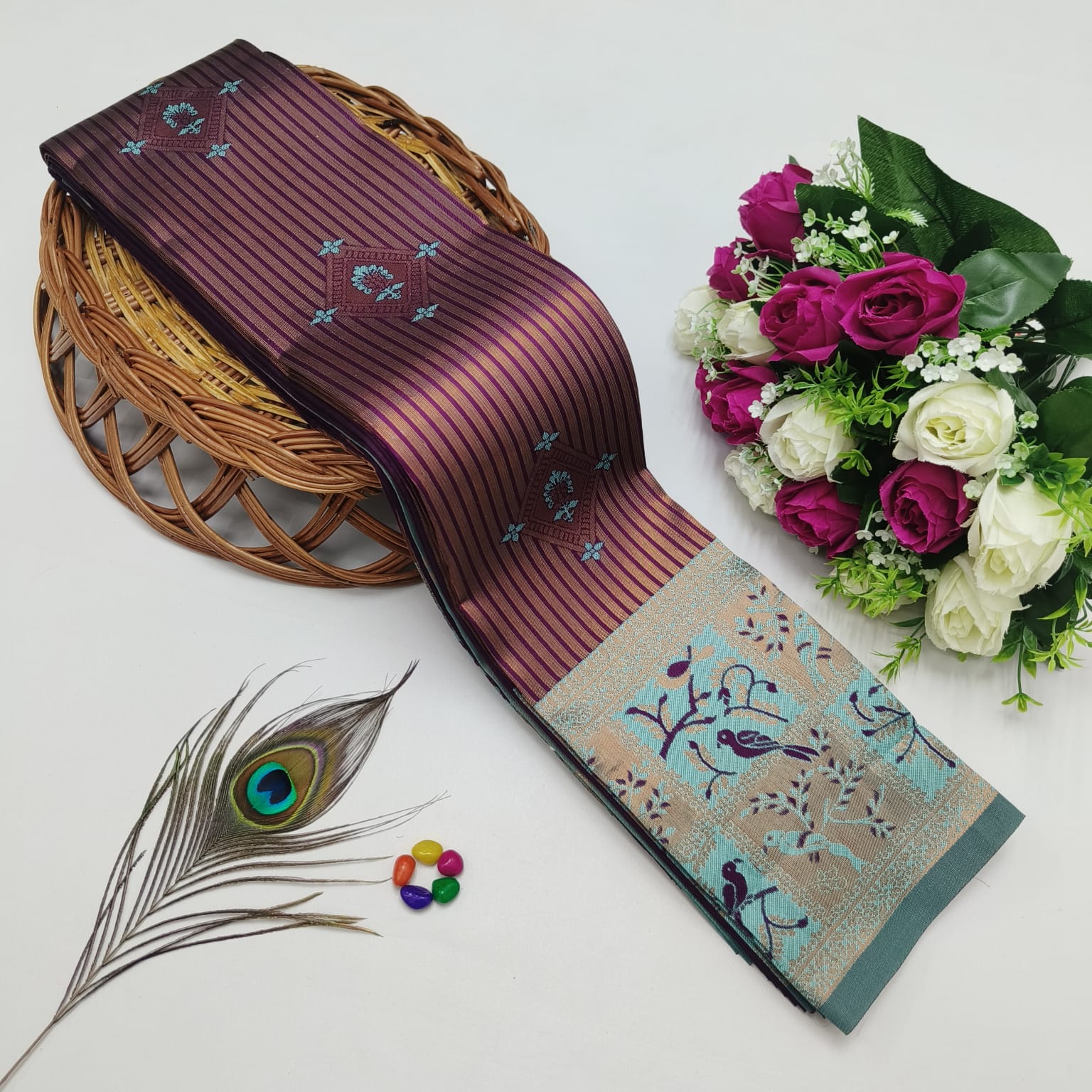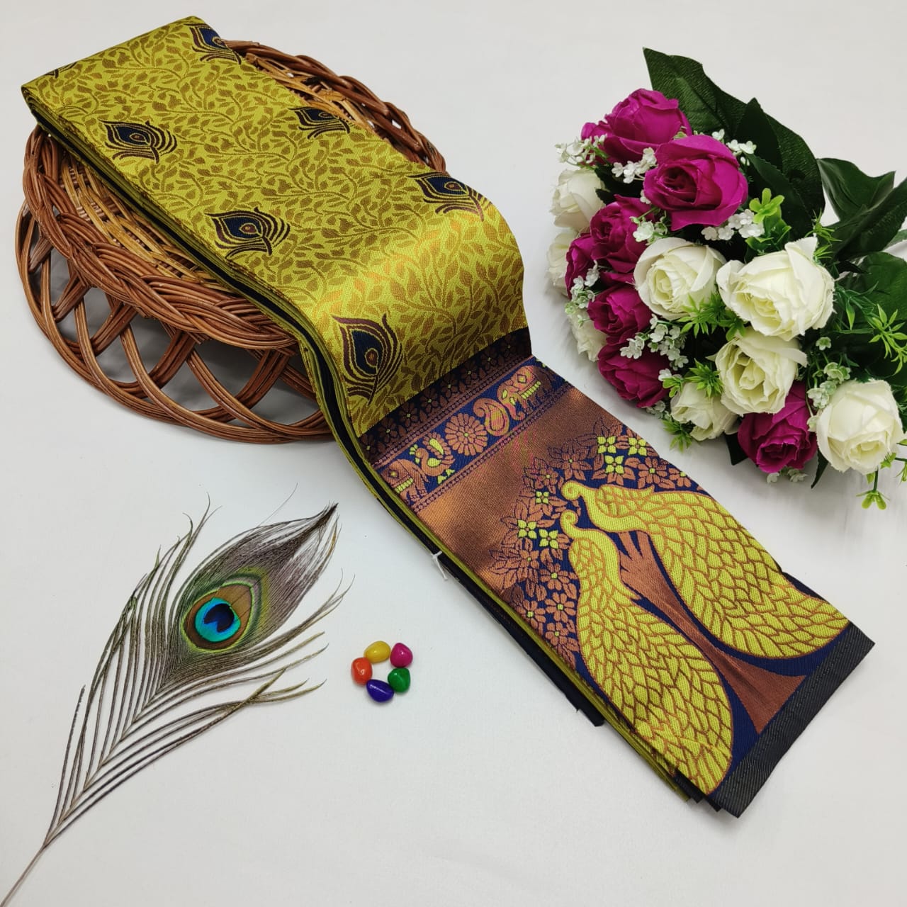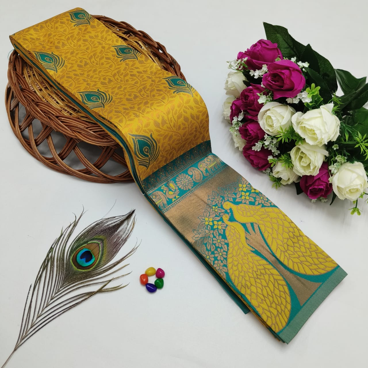 Pallu & Blouse: Rich contrast pallu paired with a matching contrast blouse piece.