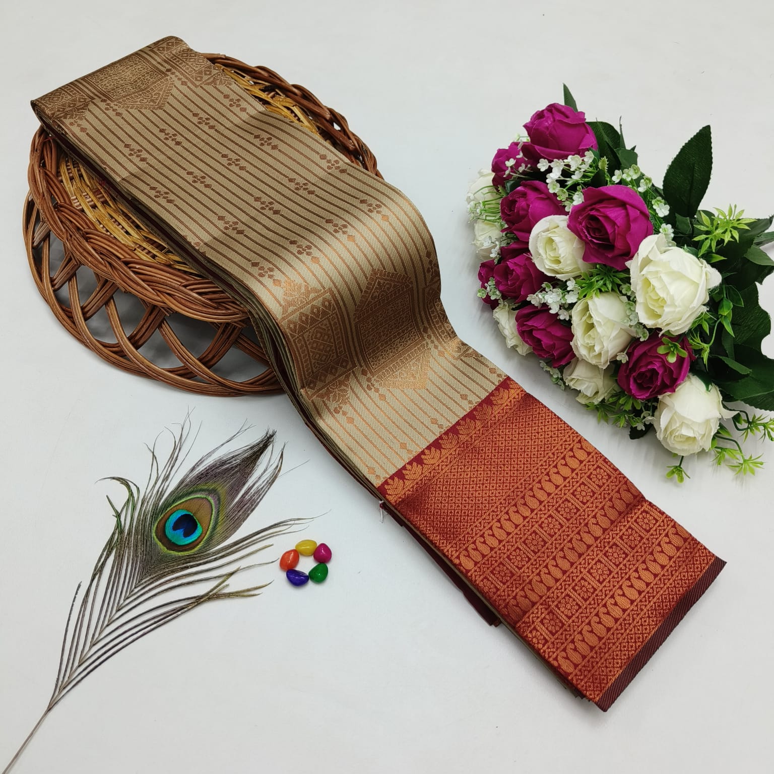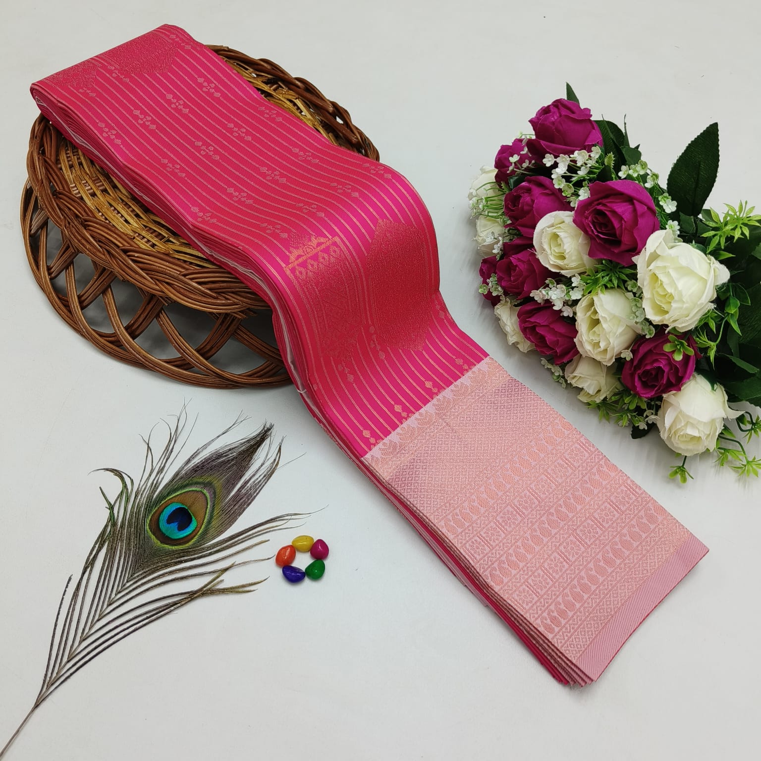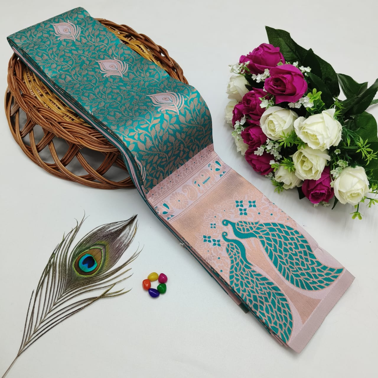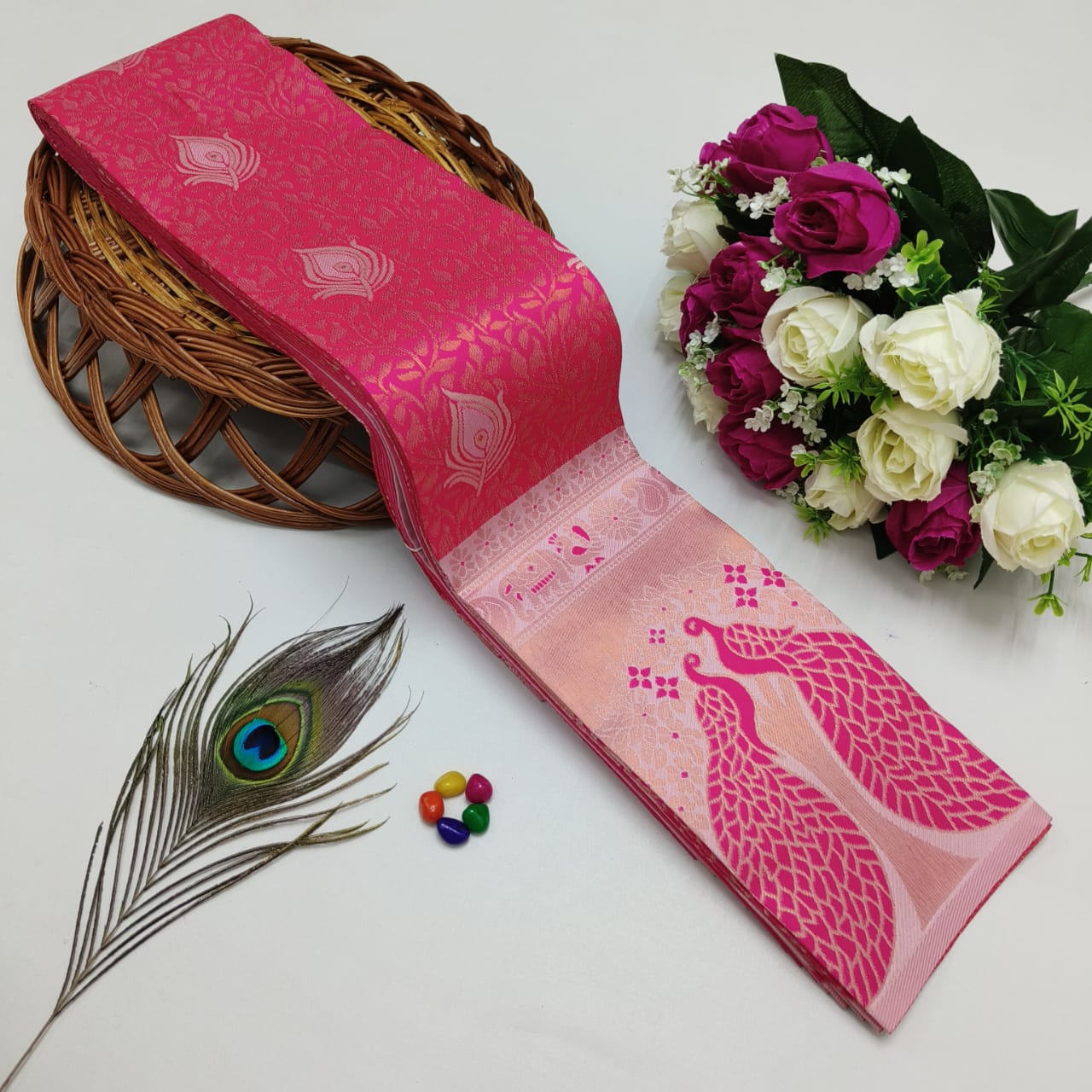 Zari Work: Rose Gold Jari type weaving with 110 Karizma shine effect.