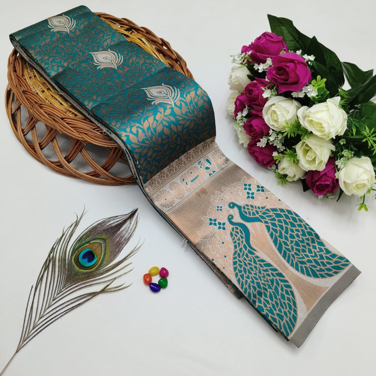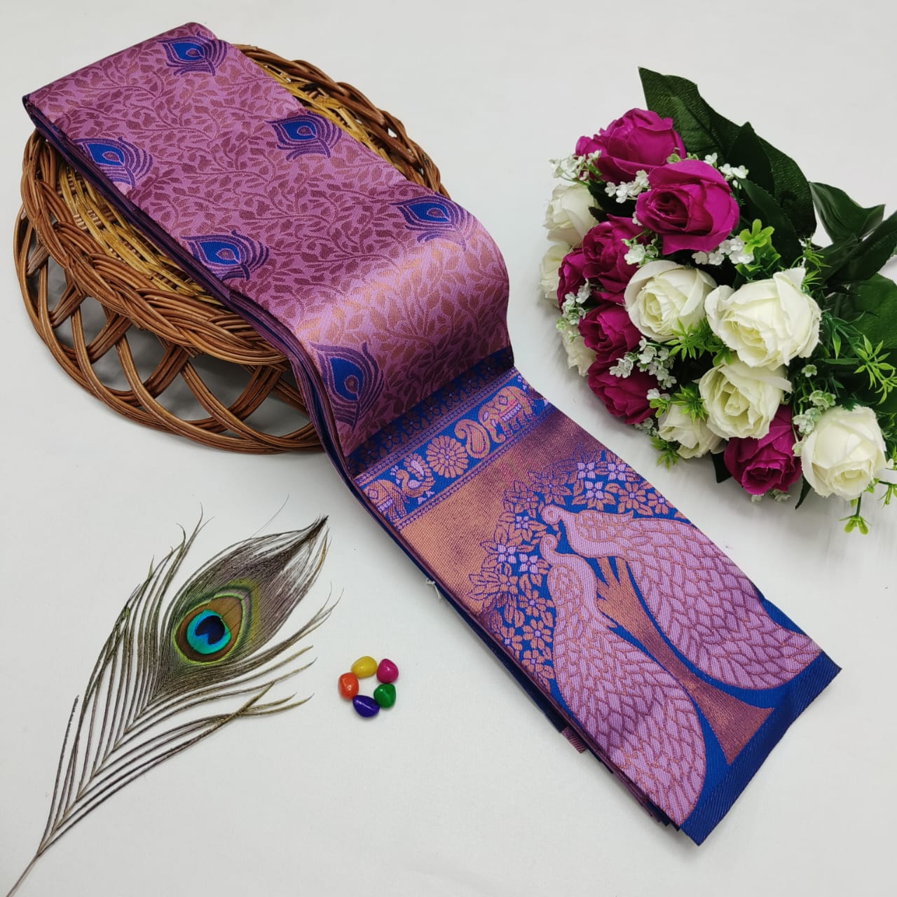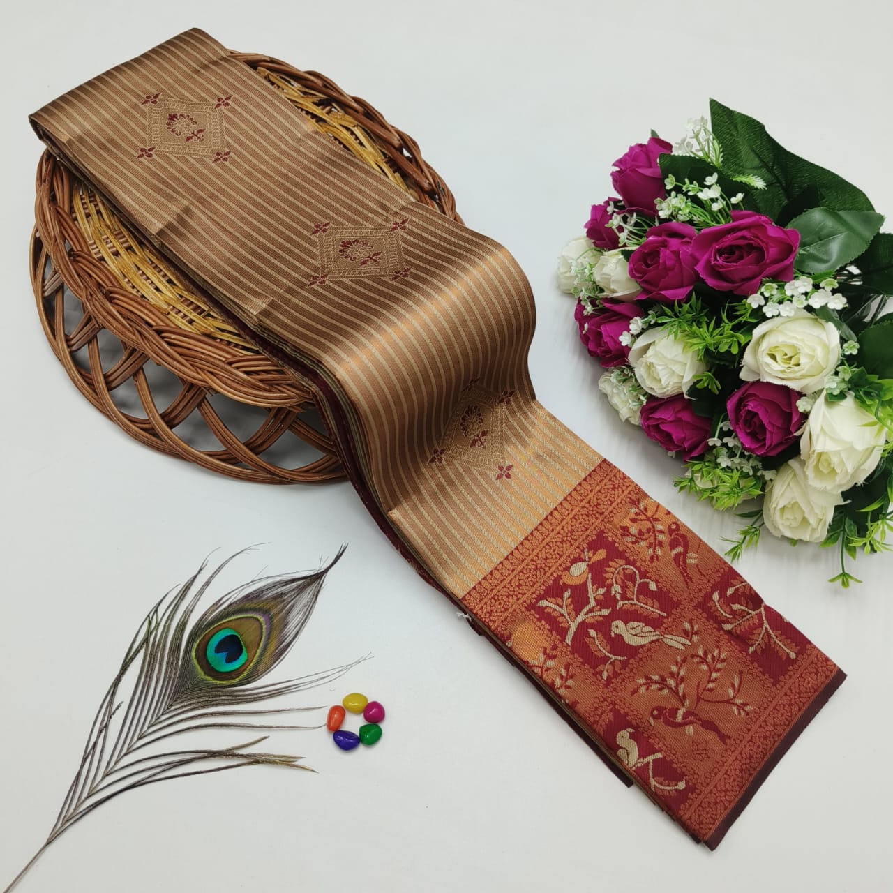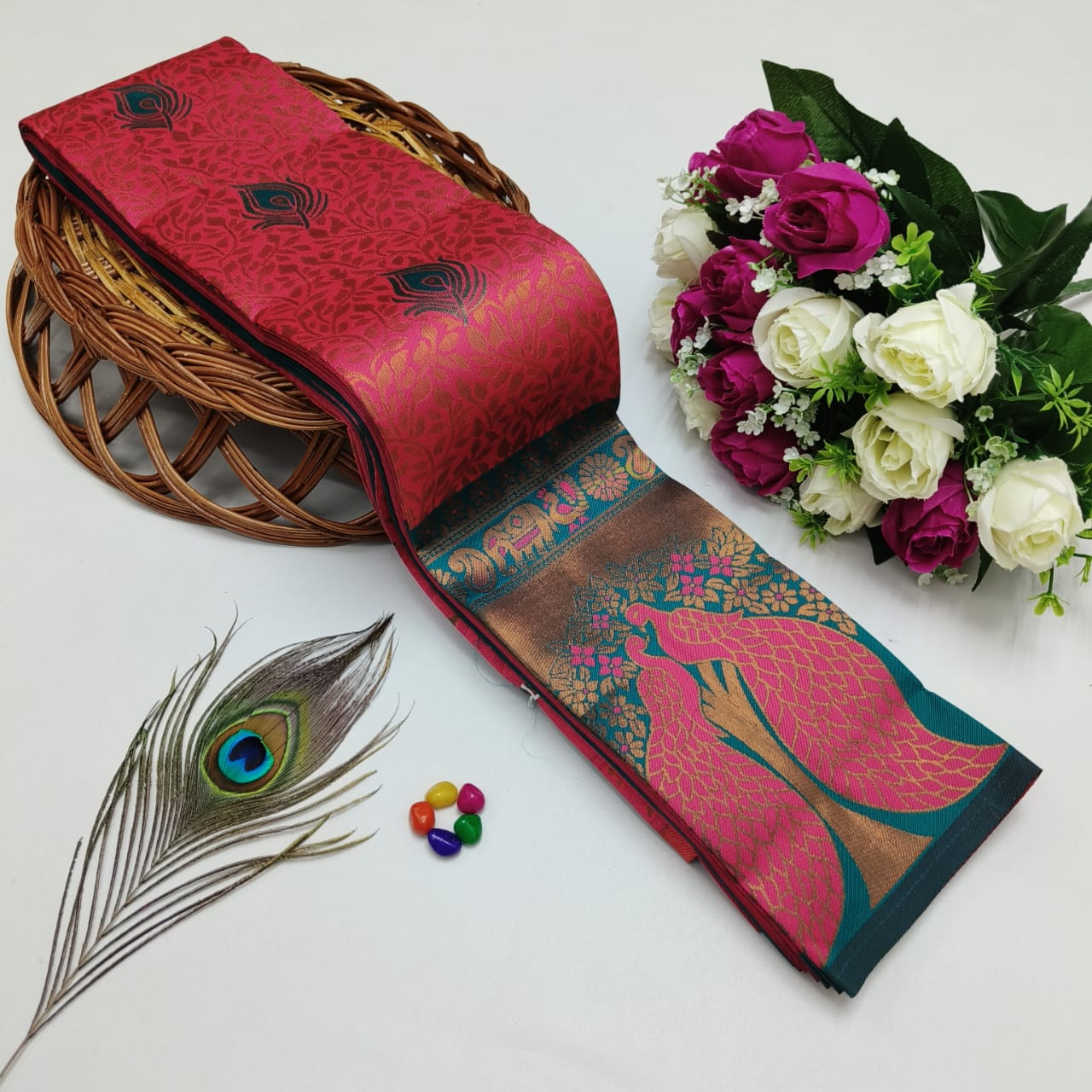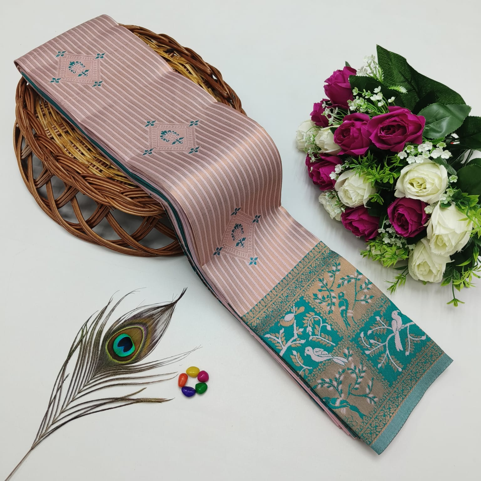 Zari Work: Rose Gold Jari type weaving with 110 Karizma shine effect.