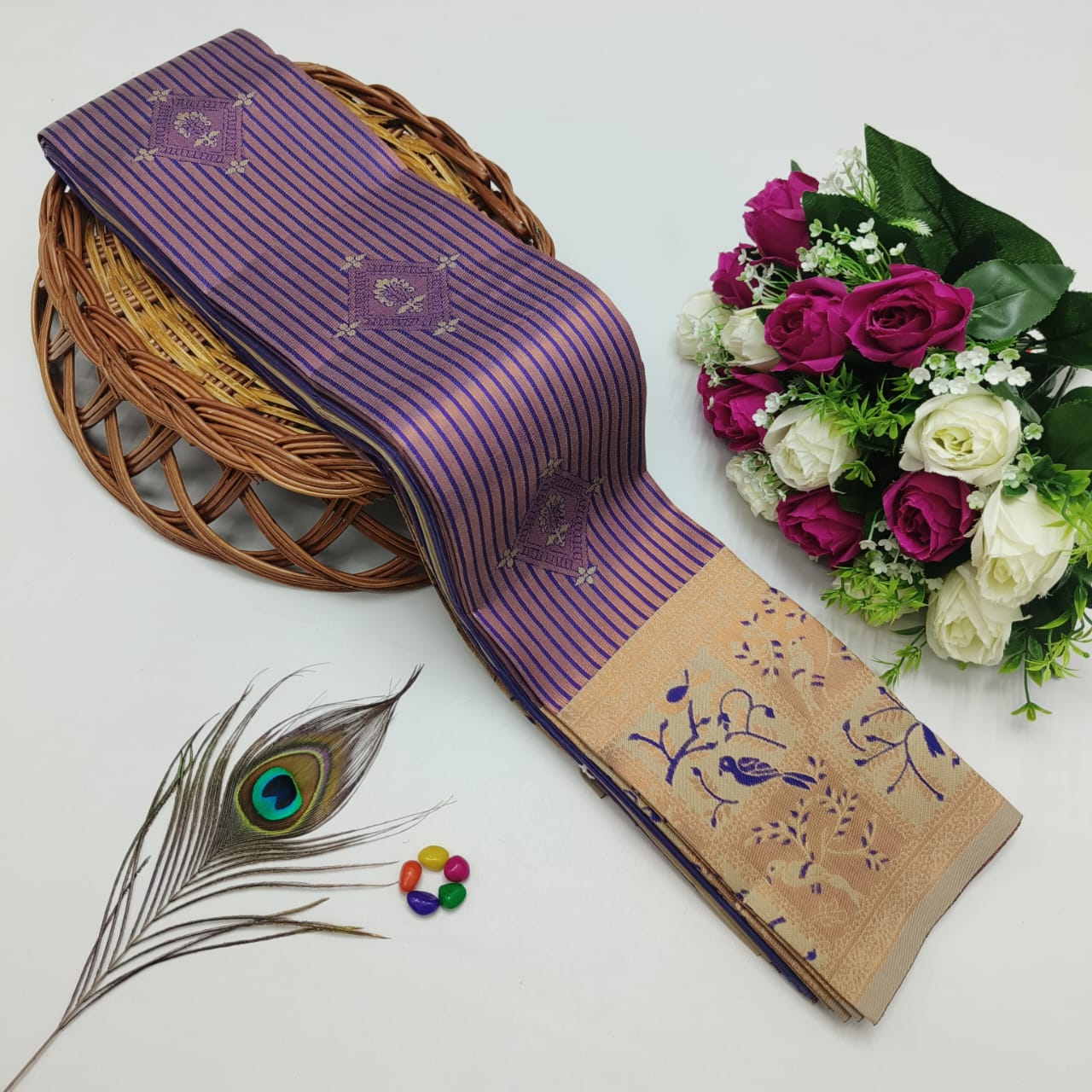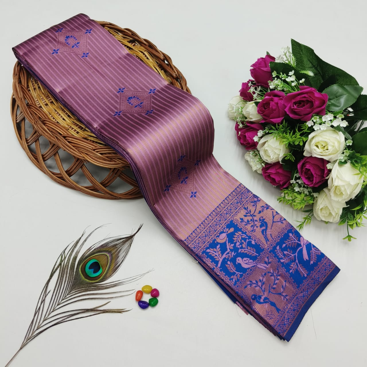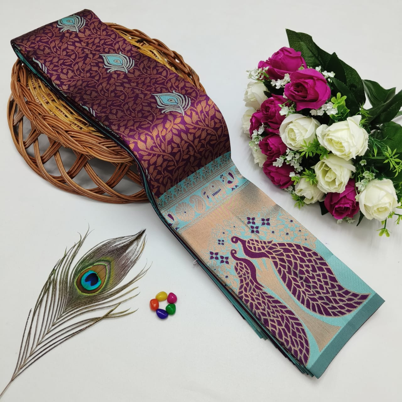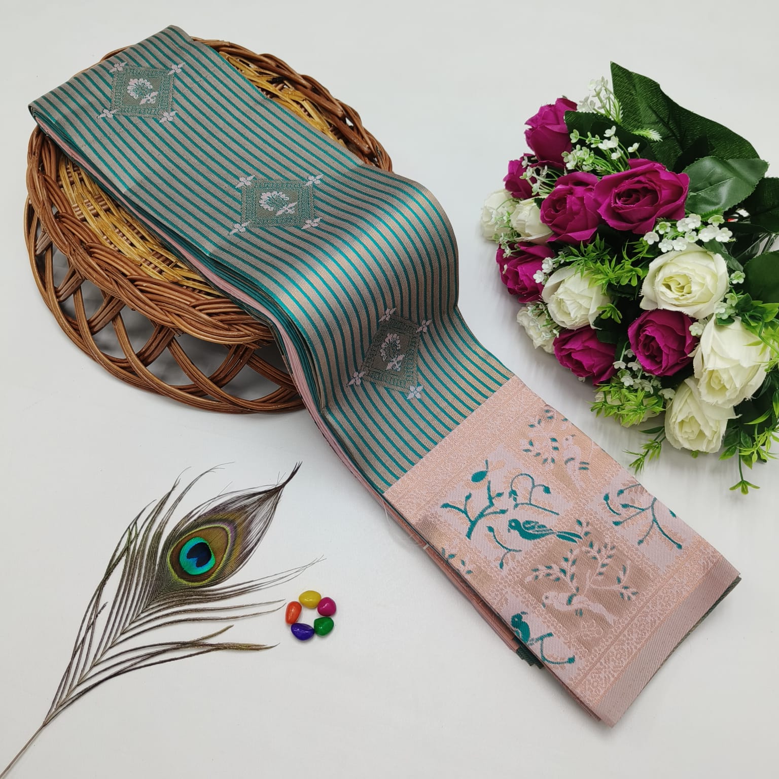 Zari Work: Rose Gold Jari type weaving with 110 Karizma shine effect.