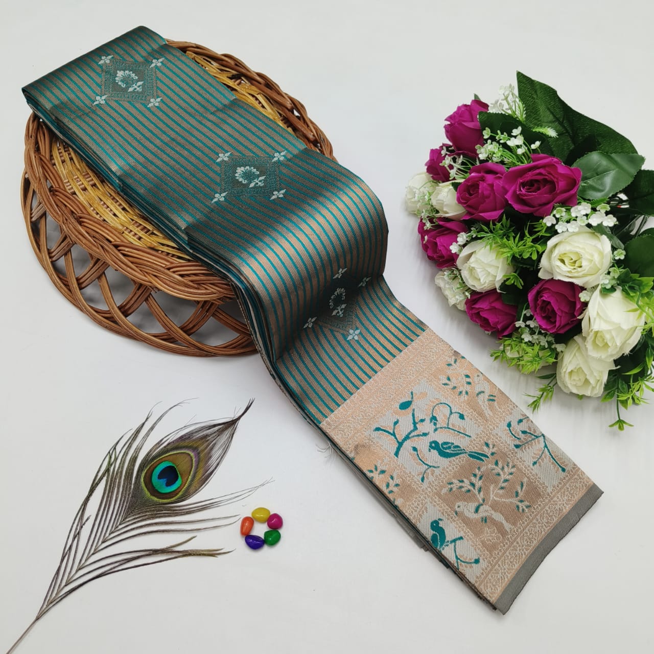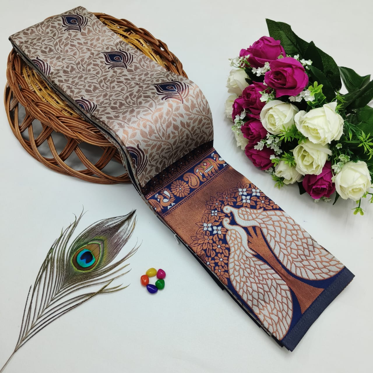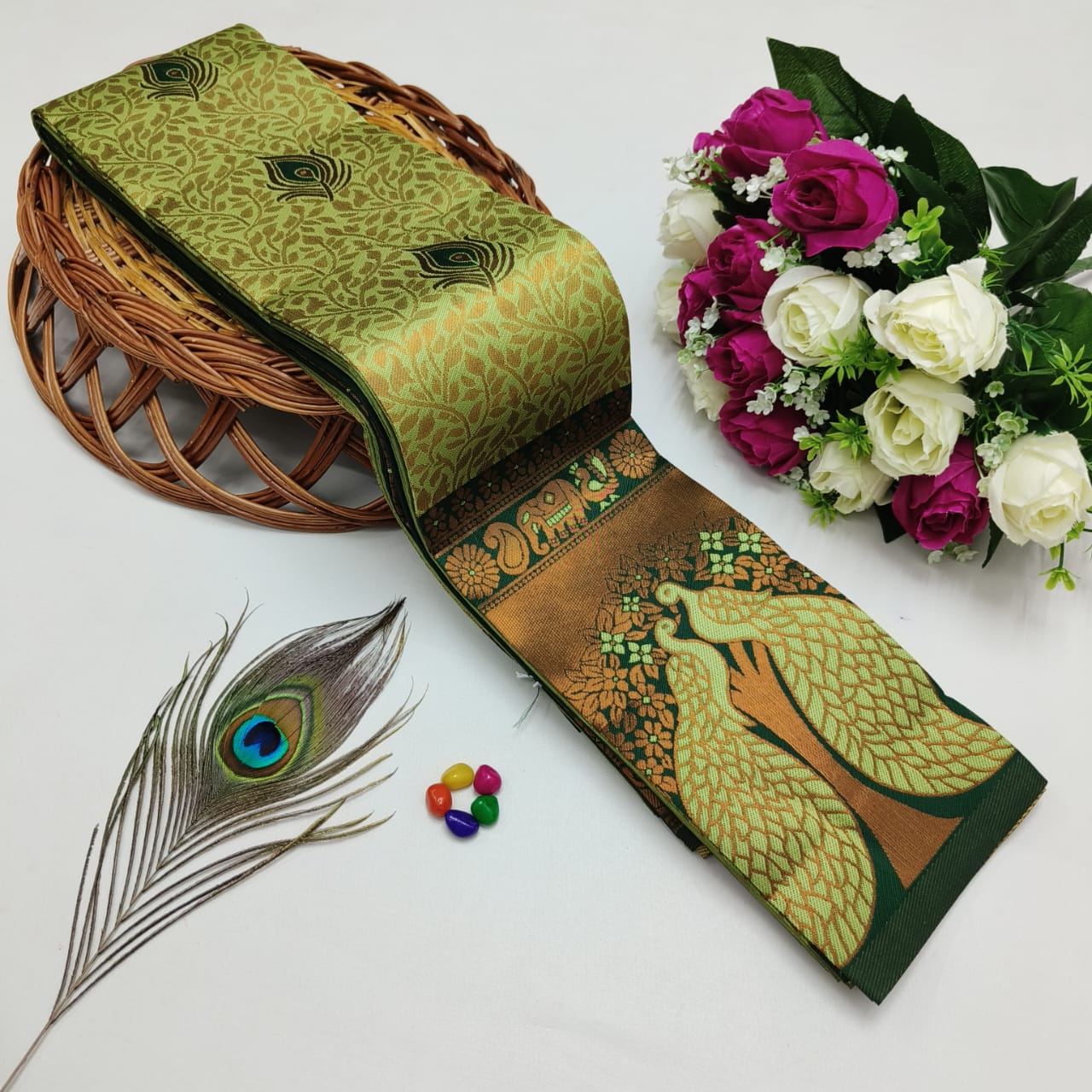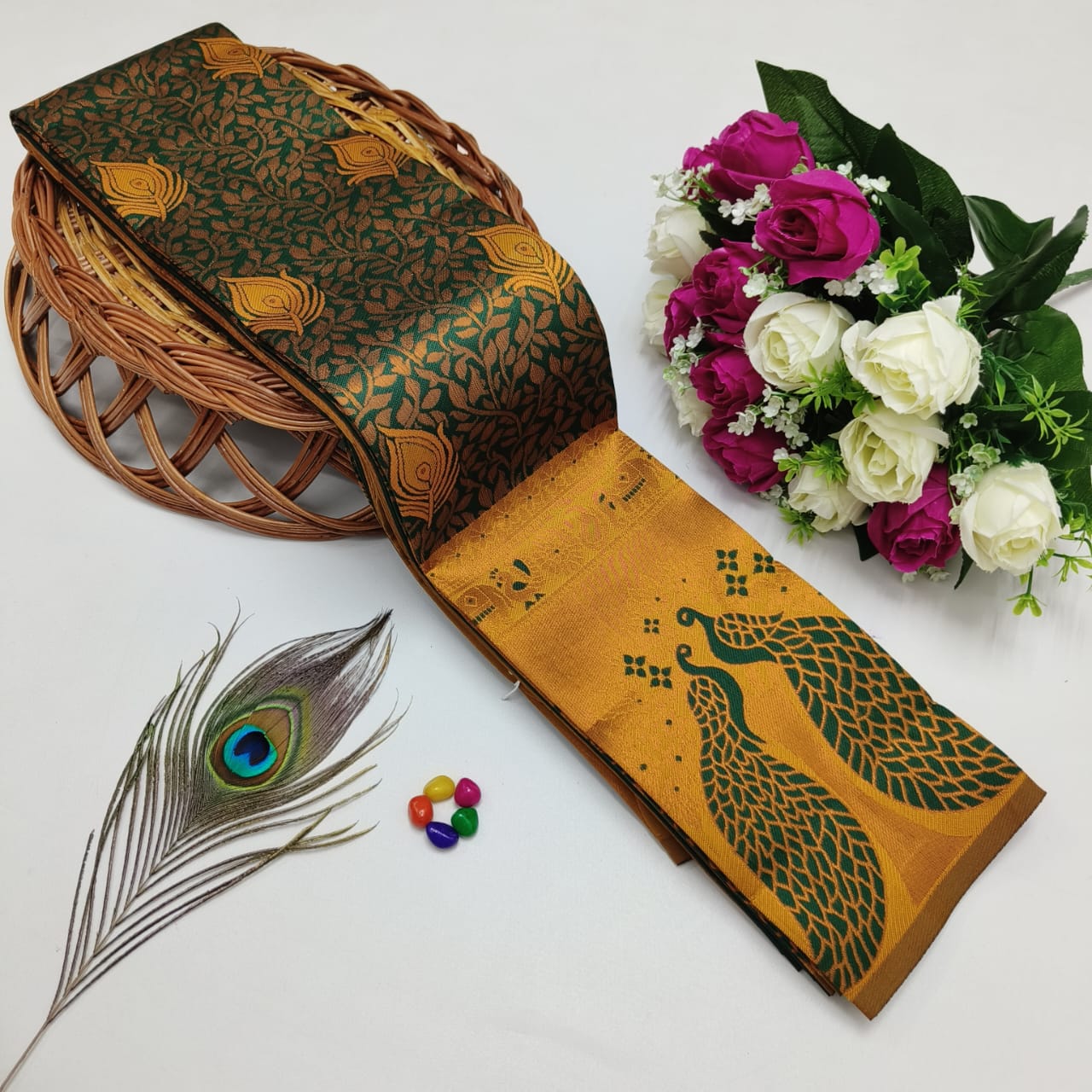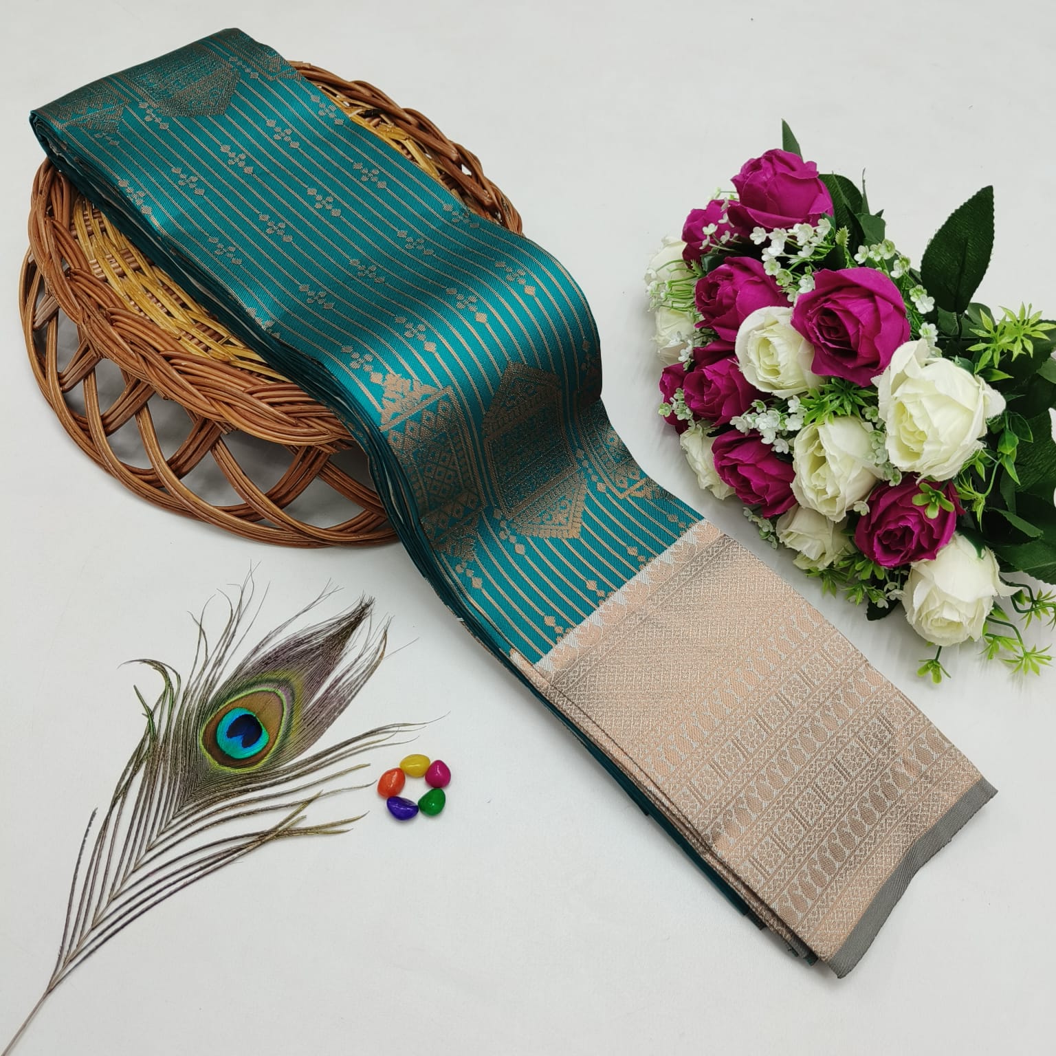 Zari Work: Rose Gold Jari type weaving with 110 Karizma shine effect.