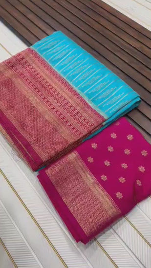 Pure Khaddi Crepe Georgette Saree with Rich Zari Weaving Border & Contrast Hand-Dyed Pallu | Original Hand Chaap Dye Saree with Running Blouse Piece | Premium Traditional Saree for Women